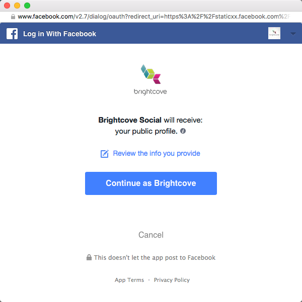 - 브라이트코브 소셜이 프로필 정보를 수신함을 확인하는 대화 상자가 열립니다. 계속을클릭합니다.