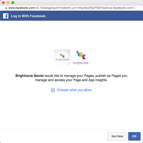 - 브라이트코브 Social이 페이지를 관리 및 게시하고 페이지 및 앱 인사이트에 액세스할 수 있음을 확인하는 대화 상자가 열립니다. 확인을 클릭합니다.
