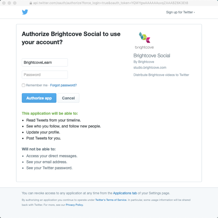 - 트위터 계정에 로그인하고 브라이트코브 소셜이 내 계정을 사용하도록 승인하라는 메시지가 표시됩니다. 동영상을 게시하려는 계정에 로그인합니다. 로그인하라는 메시지가 표시되지 않으면 Twitter 계정에 로그인한 것일 수 있습니다. 계속하기 전에 올바른 계정으로 로그인했는지 확인하십시오. 앱 권한 부여를클릭합니다.