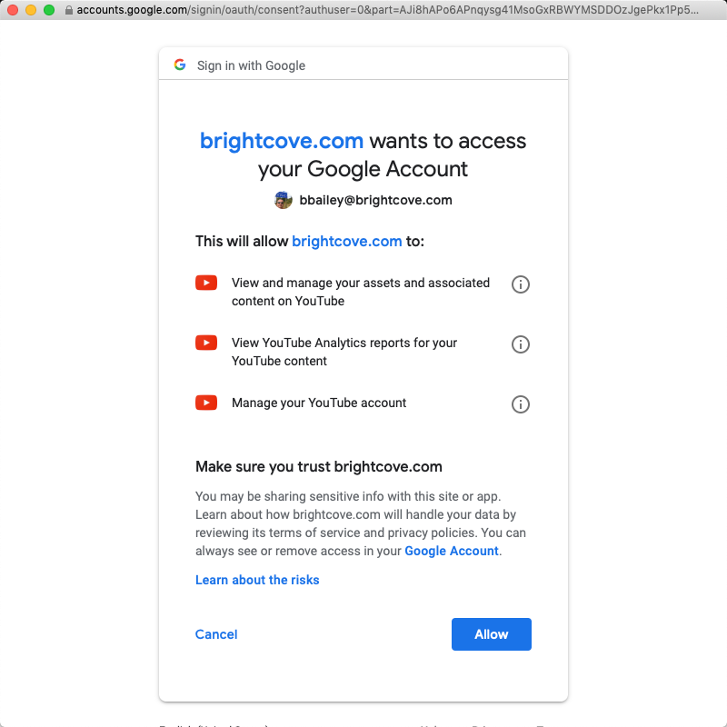 - YouTube 계정을 관리할 수 있는 권한을 요청하는 대화 상자가 열립니다. 대화 상자의 오른쪽 상단에서 올바른 Google 계정을 사용하고 있는지 확인합니다. 그렇지 않은 경우 드롭다운을 사용하여 동영상을 배포할 Google 계정을 선택합니다. 허용을클릭합니다.