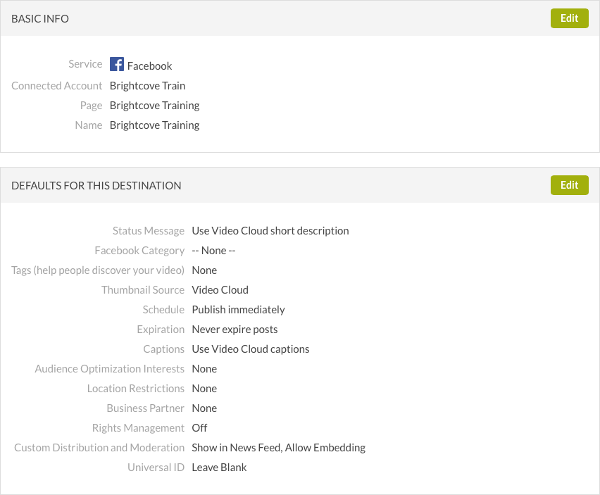 대상 기본값은소셜 플랫폼에 비디오를 게시할때 기본 비디오 속성으로 사용됩니다. Facebook 대상에 대한 게시 기본값을 구성하려면 대상 이름을 클릭한 다음이 대상의 기본값섹션에서편집을클릭합니다. 다음과 같은 Facebook 비디오 속성을 구성할 수 있습니다.