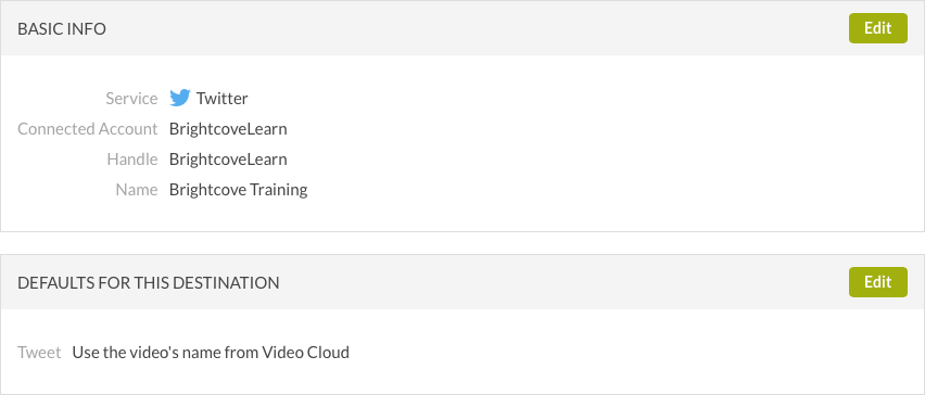 대상 기본값은소셜 플랫폼에 비디오를 게시할때 기본 비디오 속성으로 사용됩니다. Twitter 대상에 대한 게시 기본값을 구성하려면 대상 이름을 클릭한 다음이 대상의 기본값섹션에서편집을클릭합니다.