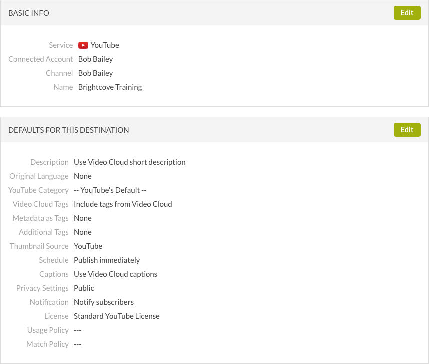 - 기본 정보 및 대상 기본값이 표시됩니다. 기본 정보섹션에서편집단추를 클릭하여 대상 이름을 편집합니다. 기본값 구성에 대한 자세한 내용은YouTube 기본값 설정섹션을 참조하십시오.