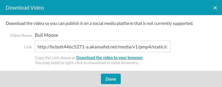 브라이트코브 소셜은 비디오 URL을 복사하거나 비디오 소스 파일을 다운로드할 수 있는 기능을 제공합니다. 다운로드 시 최고 품질의 MP4 변환이 다운로드됩니다. MP4 변환이 없으면다운로드링크가 비활성화됩니다.