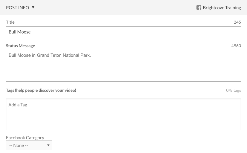- 제목 - 비디오 제목입니다 (기본값은 비디오 클라우드 제목입니다). 페이스 북은 65 자 후에 잘립니다.