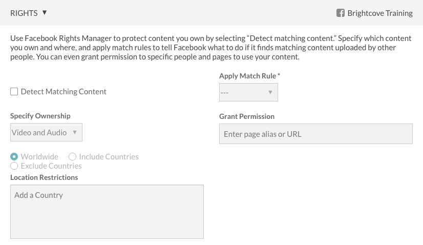 - 일치 규칙 적용 - 규칙을 선택합니다. 일치 규칙은사람들이 일치하는 동영상을 업로드할 때 발생하는 자동 동작을 결정합니다. 경기 규칙은 페이스 북의 내부에서 관리됩니다.