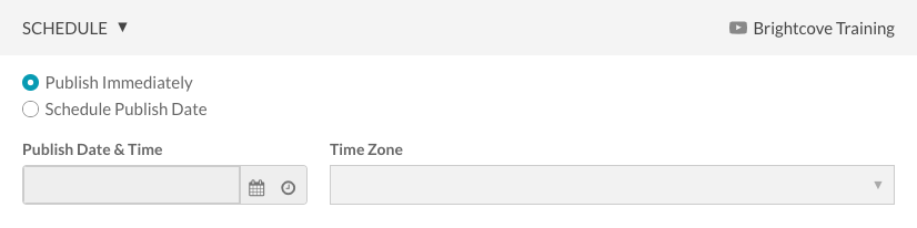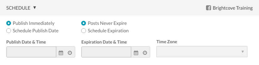 일정링크를 클릭합니다. [ 즉시 게시 ] 를 선택하여 비디오를 즉시 게시하거나 [ 게시 날짜 예약 ] 을 선택하고 [ 게시 날짜 및 시간 ] 을 선택합니다. 게시물이 만료되지않도록 설정하거나만료 예약을 선택한 다음 만료날짜 및 시간을선택할 수도 있습니다. 시간대를선택할 수도 있습니다.