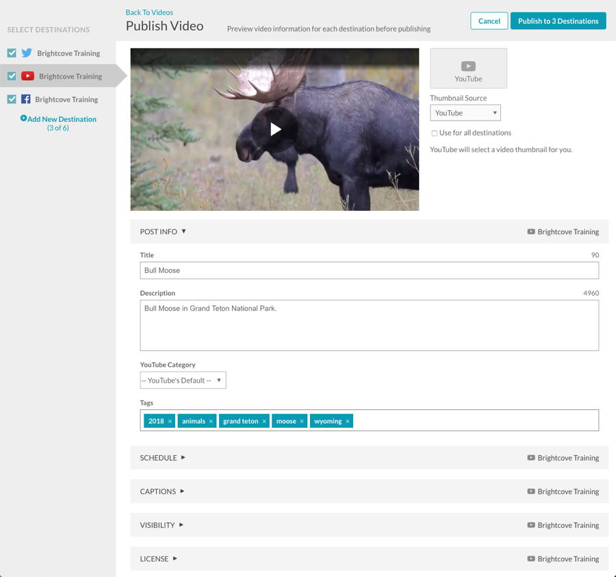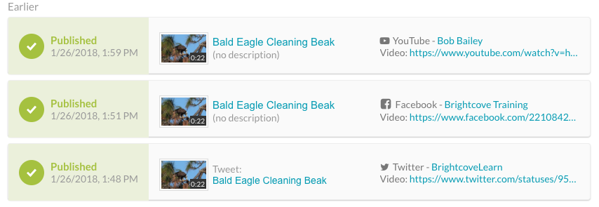 브라이트코브 소셜을 사용하면 비디오 클라우드 계정의 동영상을 YouTube, 페이스북, 트위터에 쉽게 게시할 수 있습니다. 비디오를 게시하려면 먼저 비디오를 게시할 소셜 계정에 대한 게시 대상을 만들어야 합니다. 게시 대상 만들기에 대한 자세한 내용은소셜 미디어 게시 대상 만들기를참조하십시오.