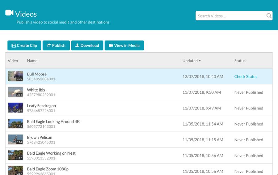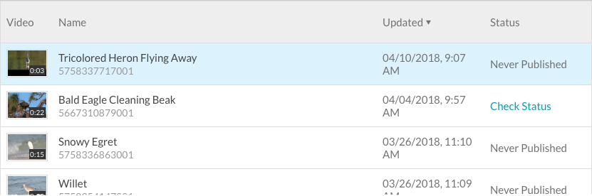 - 왼쪽 탐색에서 [ 비디오 ] 를 클릭합니다. Video Cloud 계정의 동영상 목록이 표시됩니다. 소셜 미디어 계정에 게시되지 않은 동영상의상태는'게시 안됨'으로표시됩니다. 게시된 동영상은상태 확인을표시합니다. 링크를 클릭하면 소셜 미디어 대상에서 비디오의 게시 상태를 볼 수 있습니다.