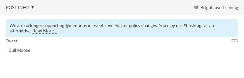 POST 정보링크를 클릭하고트윗콘텐츠를 입력합니다. @mentions 트위터로 전송될 때 #hashtags 로 변환됩니다. 자세한 내용은 블로그 게시물인브라이트코브 소셜에서 트위터 @mentions 사용 중단을참조하십시오.