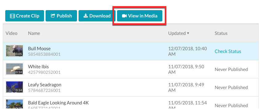- 왼쪽 탐색에서 [ 비디오 ] 를 클릭합니다. Video Cloud 계정의 동영상 목록이 표시됩니다.