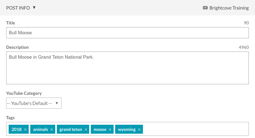 - 태그 - 비디오의 태그 (기본값은 비디오 클라우드 태그입니다). 특정 태그 수 제한은 없습니다. 태그당 최대 30자를 사용할 수 있으며 텍스트 필드에는 최대 500자를 사용할 수 있습니다.