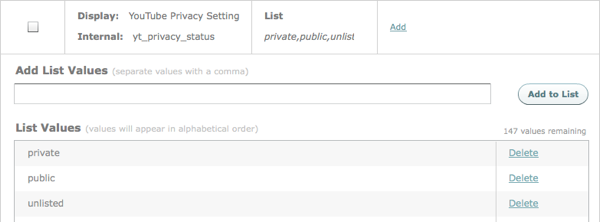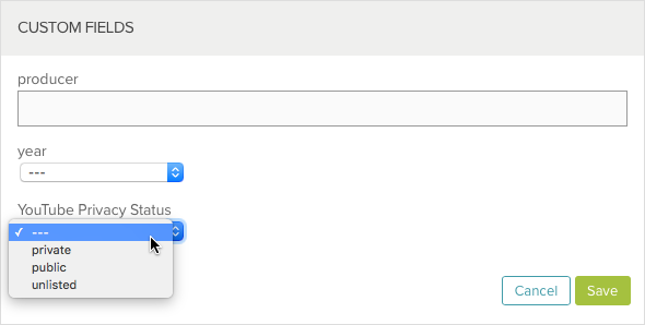 계정에 사용자 정의 필드를 추가하여 시작하십시오. 목록유형의yt_privacy_status . 계정에 사용자 정의 필드를 추가하는 방법에 대한 자세한 내용은사용자 정의 메타데이터 필드 생성을참조하십시오. 이 사용자 정의 필드의 값을 설정하면 YouTube 동영상 개인 정보 보호 설정이 제어됩니다.