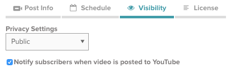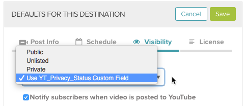 동영상이 선택되고 YouTube 대상이 선택되면 맞춤 필드를 사용하여 설정된 개인 정보 보호 상태가 됩니다.